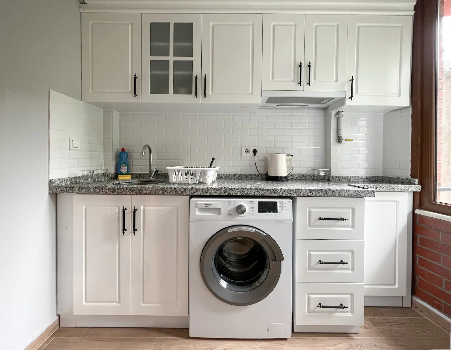 The apartment is equipped with all needed appliances. Washing machine, iron and ironing table, floor cleaners.. and other tools.